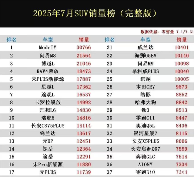 随着各款SUV车型销量数据陆续公布,7月各细分市场的销量榜也正式出炉,在SUV领域,新能源与燃油阵营依旧展现出激烈的竞争,在前十名车型中,燃油车占有6席,但新能源车销量保持相对领先,接下来我们就来看看各款车型的销量表现。