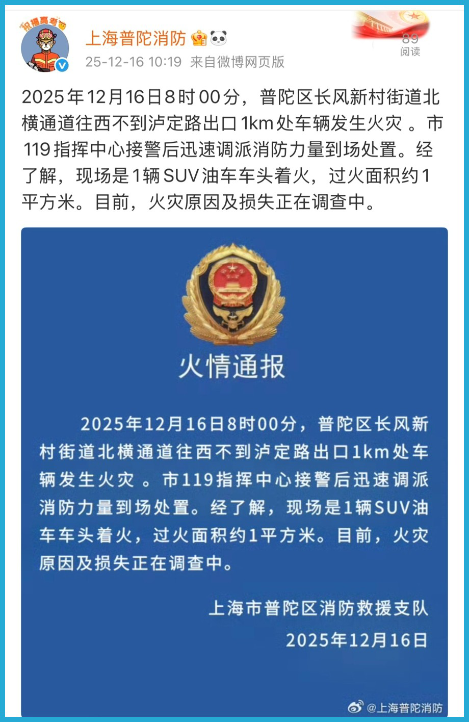 上午10时19分,普陀区消防救援支队通过微博账号“上海普陀消防”发布火情通报: